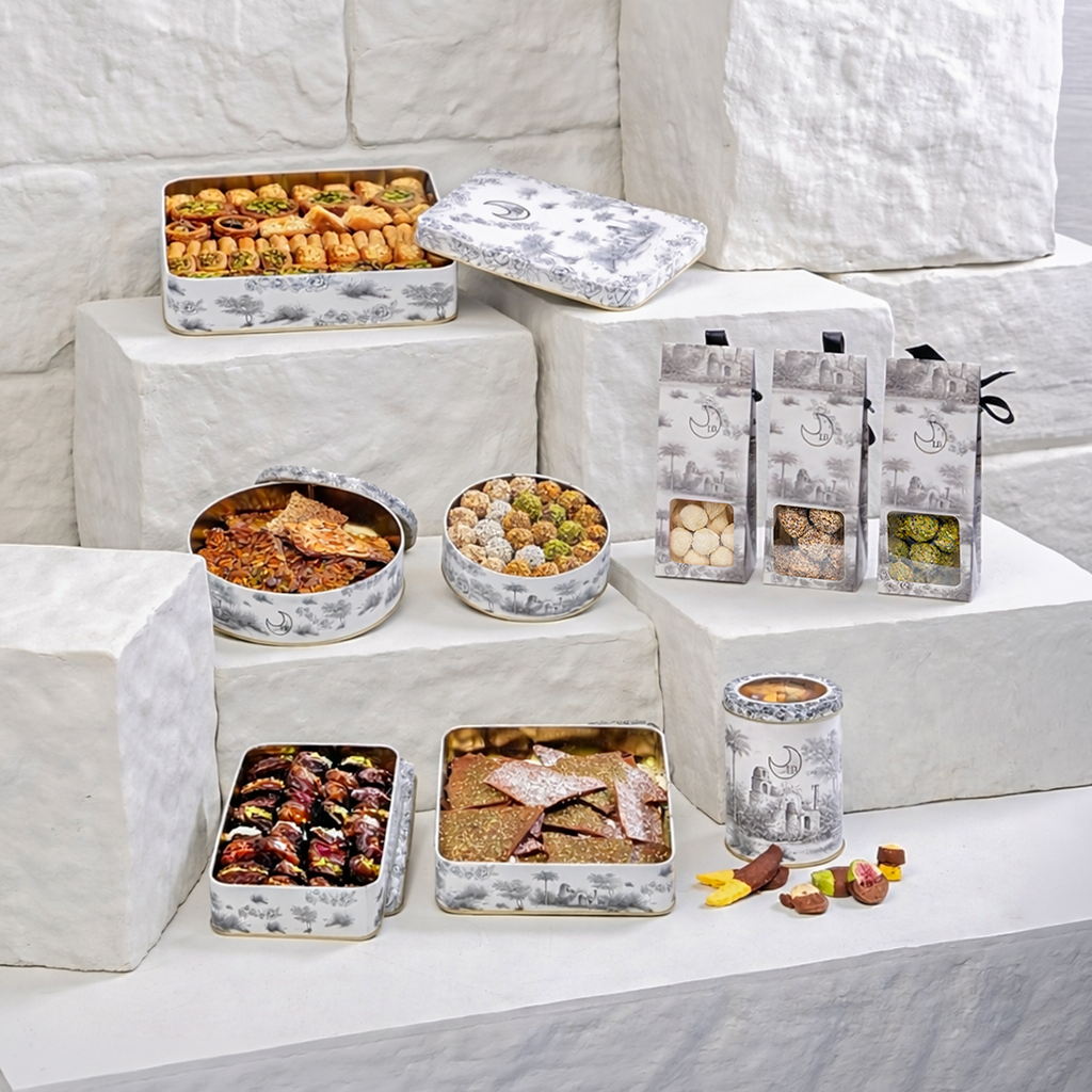 A beautifully curated assortment of premium stuffed dates, gourmet sweets, and nut treats, baklawa presented in elegant boxes and gift packs. Crafted with high-quality ingredients and rich flavors, this collection offers a perfect balance of sweetness and crunch.